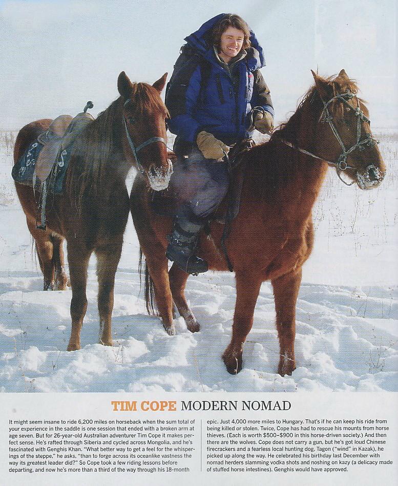 "Tim Cope: Modern Nomad" There is an excellent article about Tim in the Adventure Issue of "Men's Journal"! Click on the picture on the right. The photograph of Tim was taken in Kazakhstan, midway through his journey in the hoofprints of Genghis Khan, in February 2005. Click here to read what Tim wrote about his experiences in London at the Royal Geographical Society. |