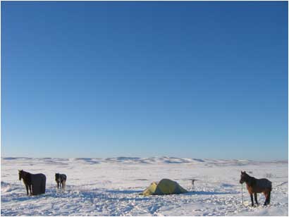 I awoke in brisk cold and checked my watch - 5.30am. Next I crawled out of my nice warm cocoon and unzipped the tent door. My heart raced as my eyes adjusted to the dim morning light. Eventually, one…… two…..three, ‘phew’ all horses still there. It was the sixth and last time I would get up during the night to check on them.