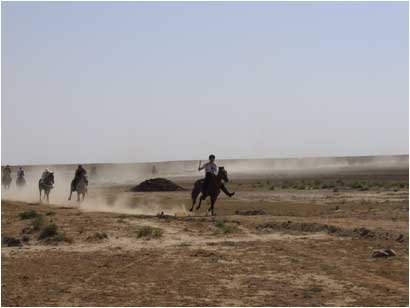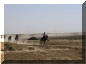 "Morning came, and with it a searing heat. The sand-dunes were soon wobbling in the liquid-looking mirage. A hard day passed. No sign of Gers, or water apart from a puddle that the horses greedily drank from. We rounded a hill and huge largely abandoned wheat crops came into view extending right up to the border of the sand. A flat plain lay ahead and what seemed like a few hours away was actually a day’s ride away. Plodding, plodding, the sun moving from our backs to our shoulders, then to our eyes in the evening. No matter what time we leave it is a long day. At 4km an hour on average 30km means about 8 hours in the saddle. A longer day for the horses no doubt. Just before we make camp an eagle swoops on us aiming for a bird that our horses have disturbed in the grass. The swishing noise, the chirp as the little bird escapes. He survives. The Eagle returns to is high circling above.