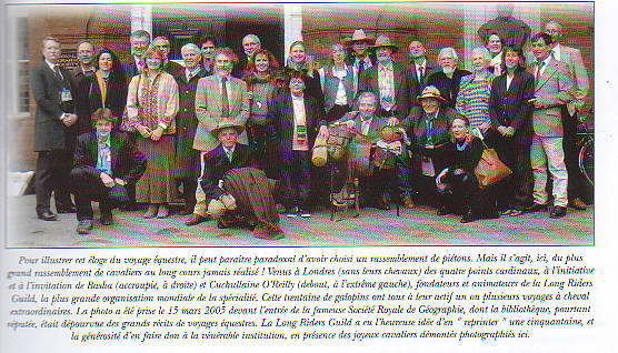 The caption to the photograph of the Long Riders in London, which illustrates an article about equestrian travel, reads: "It seems paradoxical to have chosen a gathering of pedestrians to illustrate this praise of equestrian travel. But in this case it concerns the largest assembly of Long Riders ever! They journeyed to London (without their horses) from the four points of the compass, invited by Basha (crouching, on the right) and CuChullaine O'Reilly (standing, extreme left), founders of The Long Riders' Guild, the largest organisation in the world of its type. These 29 equestrian travellers have all undertaken one or more extraordinary journeys on horseback. The photo was taken on 15th March 2005 in front of the entrance to the famous Royal Geographical Society, whose library, although of great repute, was lacking tales of equestrian journeys. The Long Riders Guild had the happy idea of "reprinting" fifty such books [actually there are more than a hundred!], and the generosity to present them to the venerable institution, in the presence of the happy cavaliers photographed here." Click on either picture to enlarge it. |