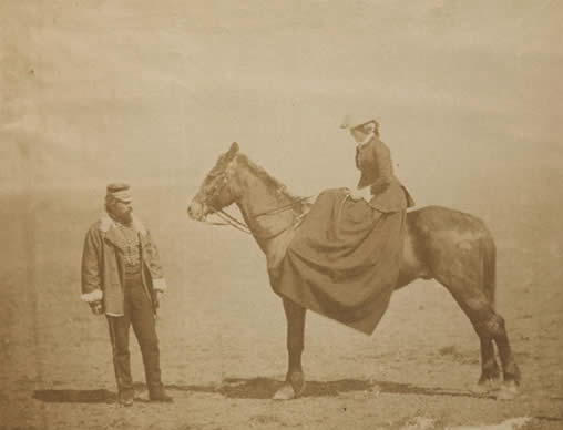 Fanny Duberly Fanny Duberly led one of the most dashing and dangerous lives of the mid-nineteenth century. In 1854, while still in her early twenties, Fanny accompanied her husband Henry and his regiment to the front lines of the Crimean War to fight the Russians. Considered the first female "embedded reporter," Fanny's eye-witness account of the horrors of the Crimean War includes the infamous Charge of the Light Brigade. After having survived bullets, cholera and shipwreck, Fanny and her husband next saw action in India. In 1857 Fanny rode more than two thousand miles through the deserts of India alongside Captain Duberly and his troops during the suppression of the Sepoy Revolt. This remarkable Long Rider was the author of two fascinating books entitled Crimean Journal and Indian Journal, both of which will soon be available at www.horsetravelbooks.com and www.classictravelbooks.com. The photograph on the left shows Fanny on her horse, Bob, with Henry standing in front of her. |