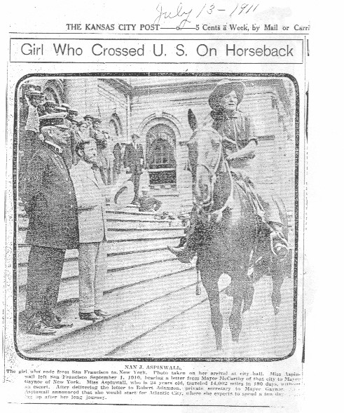 "Two-Gun Nan" Aspinwall-Gable After a five-year search, The Long Riders' Guild is able to confirm the legendary equestrian journey of the first woman to ride across North America alone. Nan Jane Aspinwall-Gable led an extraordinary life, which included being a headline act as a sharp-shooter in Buffalo Bill's Wild West Show. According to recently-discovered documentation, a disagreement between rival showmen Buffalo Bill Cody and Pawnee Bill led to the circumstances under which Nan made her solo transcontinental ride. Could a woman ride from the Pacific to the Atlantic alone? the showmen argued. Nan set off in September 1910 to prove it was possible. Mounted on her thoroughbred, Lady Ellen, the lady Long Rider carried a letter from San Francisco Mayor McCarthy addressed to his colleague, Mayor Gaynor in New York. During the course of the journey, Nan refused to allow anyone else to care for Lady Ellen, even to the point of shoeing the horse herself fourteen times. After months on the road, Two-Gun Nan and Lady Ellen arrived in New York on July 13th, 1911. According to newspaper reports at the time, the hardy equestrian traveller was awarded a diamond medal for endurance by Richard K. Fox, the long-time publisher of The National Police Gazette. In an amazing historical aside, the story of Nan's medal was later plagiarized by the notorious equestrian travel charlatan, Frank Hopkins, whose story was recently made into the fictitious movie, "Hidalgo." Although researchers have spent years trying to find information about this amazing Long Rider, her story was only uncovered thanks to the diligent academic research of Mary C. Higginbotham. For decades, equestrian researchers had fruitlessly searched for clues to the ride and life of Nan Aspinwall. Mary discovered that Nan's work as an entertainer and traveller was undertaken under her married name of Nan Gable. The Long Riders' Guild is proud to announce the forthcoming publication of the story of Two-Gun Nan entitled "In Genuine Cowgirl Fashion." This book contains all of Mary Higginbotham's unique research and will be amply illustrated with never-before-seen photographs of Nan in the saddle and on the stage. For more information about this book, please email The Guild. |