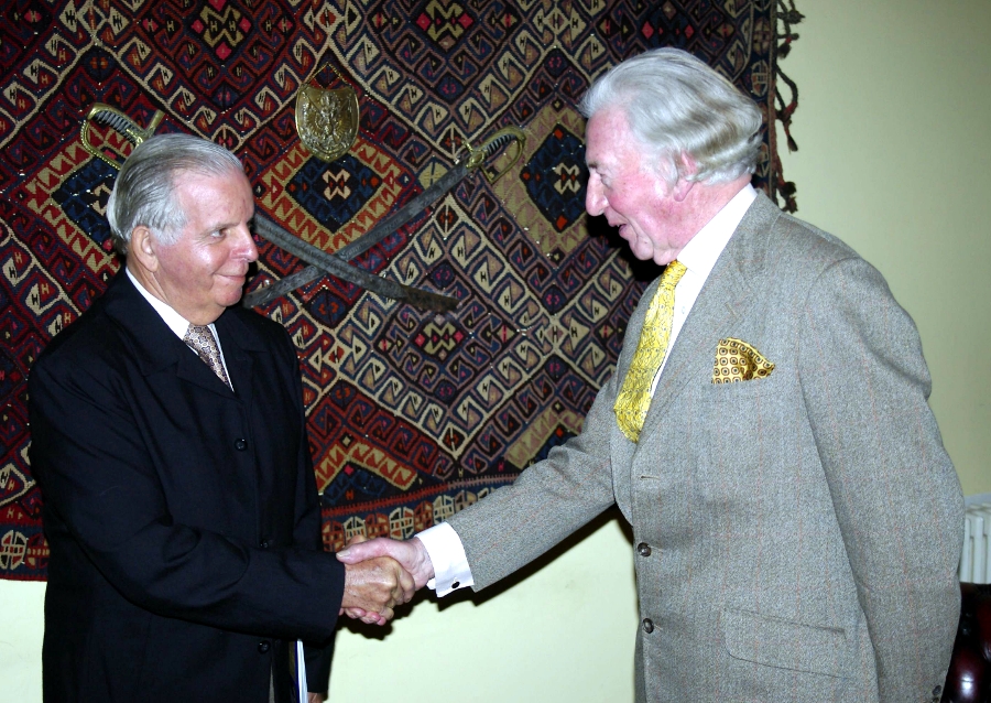 On March 15, 2005, twenty-eight Long Riders from five continents assembled in London at the Royal Geographical Society. During that meeting Sir John Ure (right) greeted Pedroca, who had been made a Fellow of the Royal Geographical Society in recognition of his extraordinary equestrian journey. |