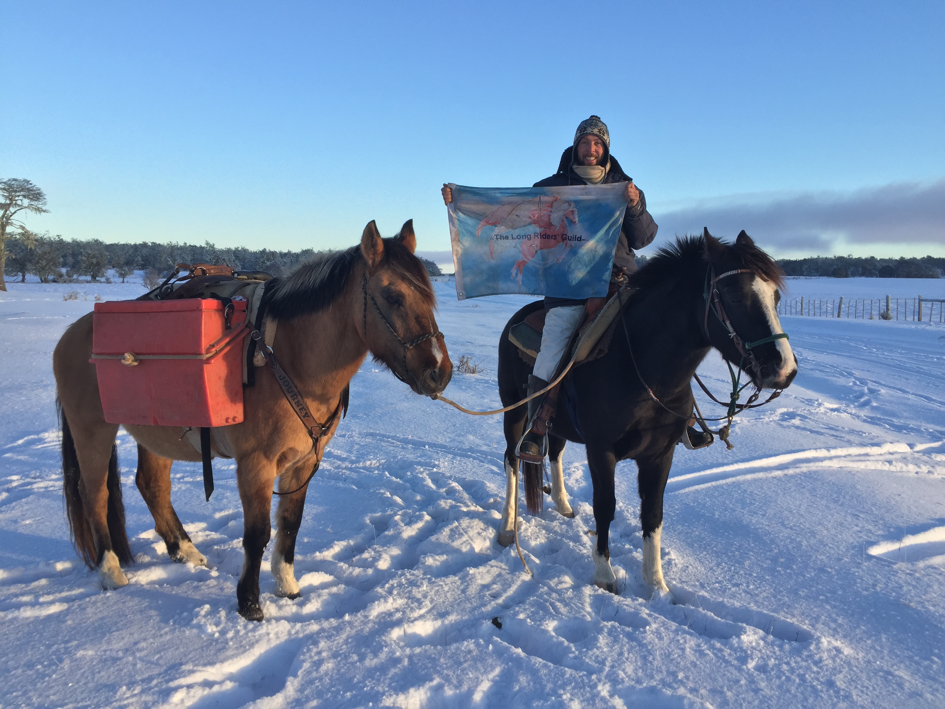 The Guild flag that Pedroca is carrying across Brazil is the same well-travelled banner carried by Filipe Leite. Riding “Across the Americas,” from Alaska to Tierra del Fuego; this photo shows Filipe and the flag arriving in Patagonia in 2017. |