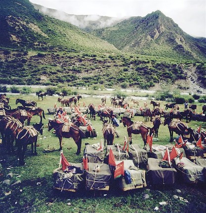 Not surprisingly, the infamous route stopped being use in the 1960s when motorized roads were opened. That’s why I was lucky to meet up by chance with the Pu-Ur Tea Company. They were a group of Chinese men who were re-enacting history for charity. Their mission was to travel to Lhasa with a hundred mules laden with tea. That’s how I came to walk with them for 65 days, journeying with them from Yunnan to Lhasa. Accompanying me were my two mules, Mei Ling and Hu May.