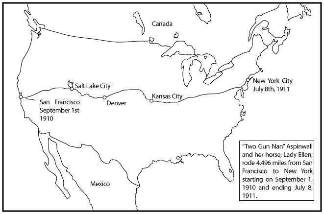 The first woman to ride “ocean to ocean” across the United States was Two Gun Nan Aspinwall. Mounted on her Thoroughbred mare, Lady Ellen, the duo set off in 1910. |