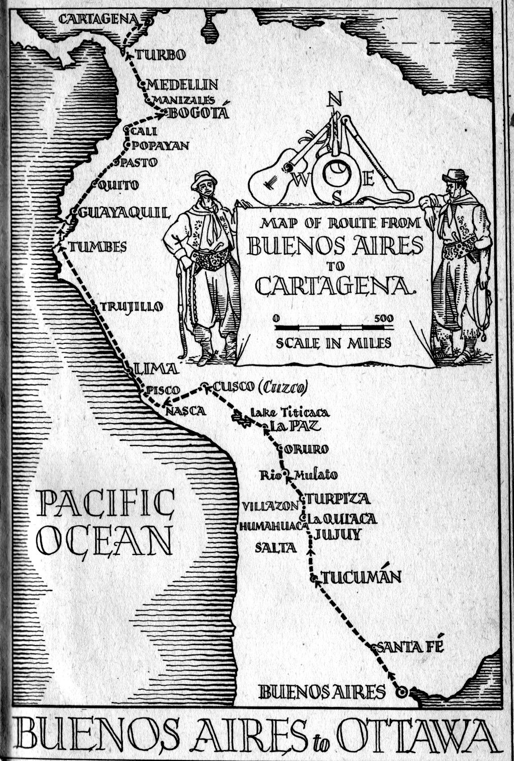 With her eyes always on the horizon, Beker began a 27,500 kilometres (17,000 miles) mounted odyssey that took her from Buenos Aires, Argentina to Ottawa, Canada. The journey began in 1952. This map shows her route across South America. | |