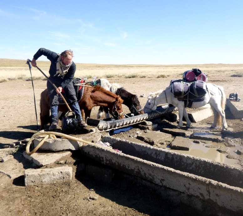 | Nic Cuthbert draws water from a well. Donna commented on the constant need to supply the horses with water. “Our daily struggle was always grass and water; it really puts everything into perspective when you do or do not have access to those two things. Mongolia as a country has a well or water source every 20 kilometre or so and our entire crossing was based on those way points. Many people have asked us about the quality of the water in Mongolia and whether or not it was safe to drink from the wells or springs. We relied heavily on our horse Kitay for this as he was incredibly fussy with the water that we offered him. If he turned his nose up at it, it wasn't any good for us and whilst this only happened a handful of times during our five months it does go to show how smart these beauties are. If the well was frequented by locals then it was almost always perfect water, if it was in a deserted area you may find dead birds in the well or if the only source was a slow moving stream you'd probably want to assess how many animals excreted into it before drinking it yourself.” |
