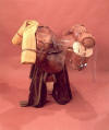 Swiss Long Rider Otto Schwarz rode nearly 50,000 kilometres (32,000 miles) on five continents; thereby making him the most travelled Long Rider of the 20th century. He rode in a Swiss cavalry saddle made in 1913. The canvas bag in the front of the saddle holds a two day ration of grain, which is equally divided. The two pommel bags contain the essentials for horse and rider, including a spare horse shoe, eight horse shoe nails, a hoof pick and brush. A mess kit, which holds a folding canvas bucket, rests on the left side of the saddle. Otto carried a change of clothes and wash kit in the soft leather bag which rested behind the cantle. |