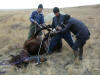 | It could be worse. In certain parts of the world the treatment afforded to horses in need of shoes involves a shocking degree of ruthless efficiency. Kazakhs, for example, routinely throw a horse to the ground, tie all four feet tightly together and then roll the animal onto its back. While several men keep the animal from struggling, the hooves are quickly cut and shoes nailed into place as fast as possible. |