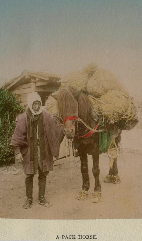 image on the right shows a Japanese pack horse wearing bamboo boots in the
