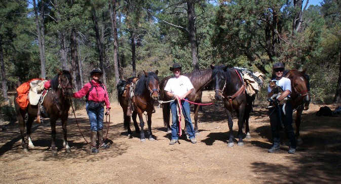 | Günter and Sonja have met up with Long Rider Silke Schneider! Click on picture of the three explorers and their four-footed friends on the Continental Divide Trail in Silver City, Little Walnut, New Mexico to enlarge it. The photograph was taken by the chairman of the Backcountry Horsemen Association, Gila Chapter, Gerry Thompson in May, 2008. |